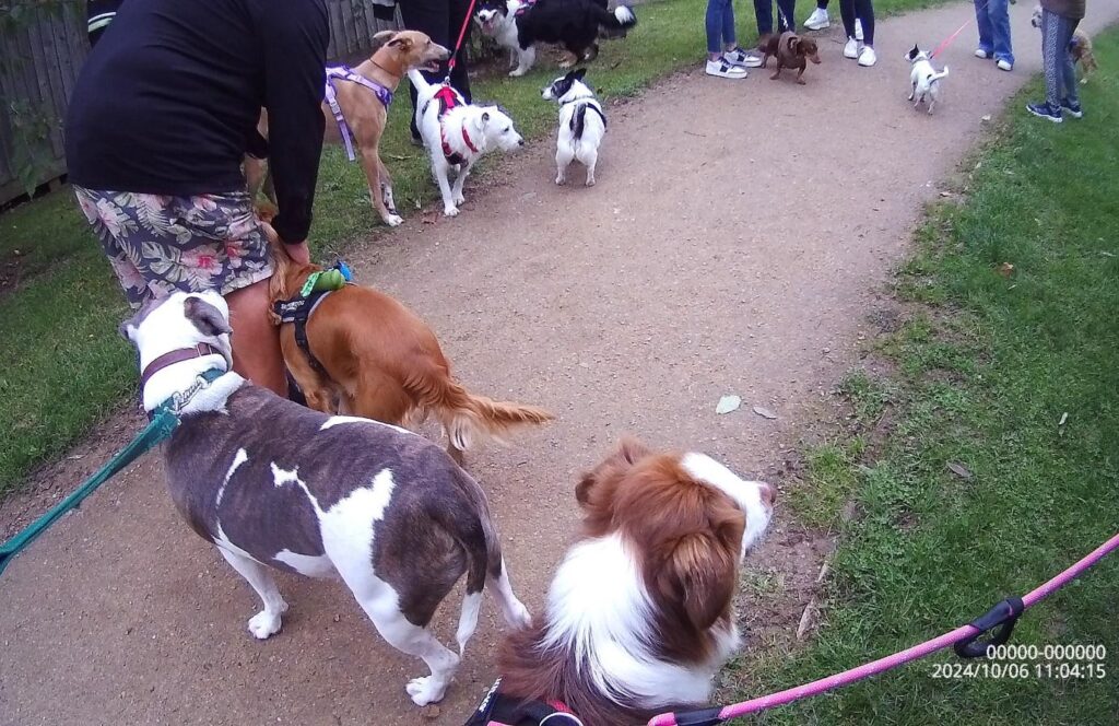 A calm and quiet Belle (with the lilac harness) happily surrounded by some of her new friends just 20 minutes into what her new family believe was her first ever walk with other dogs !